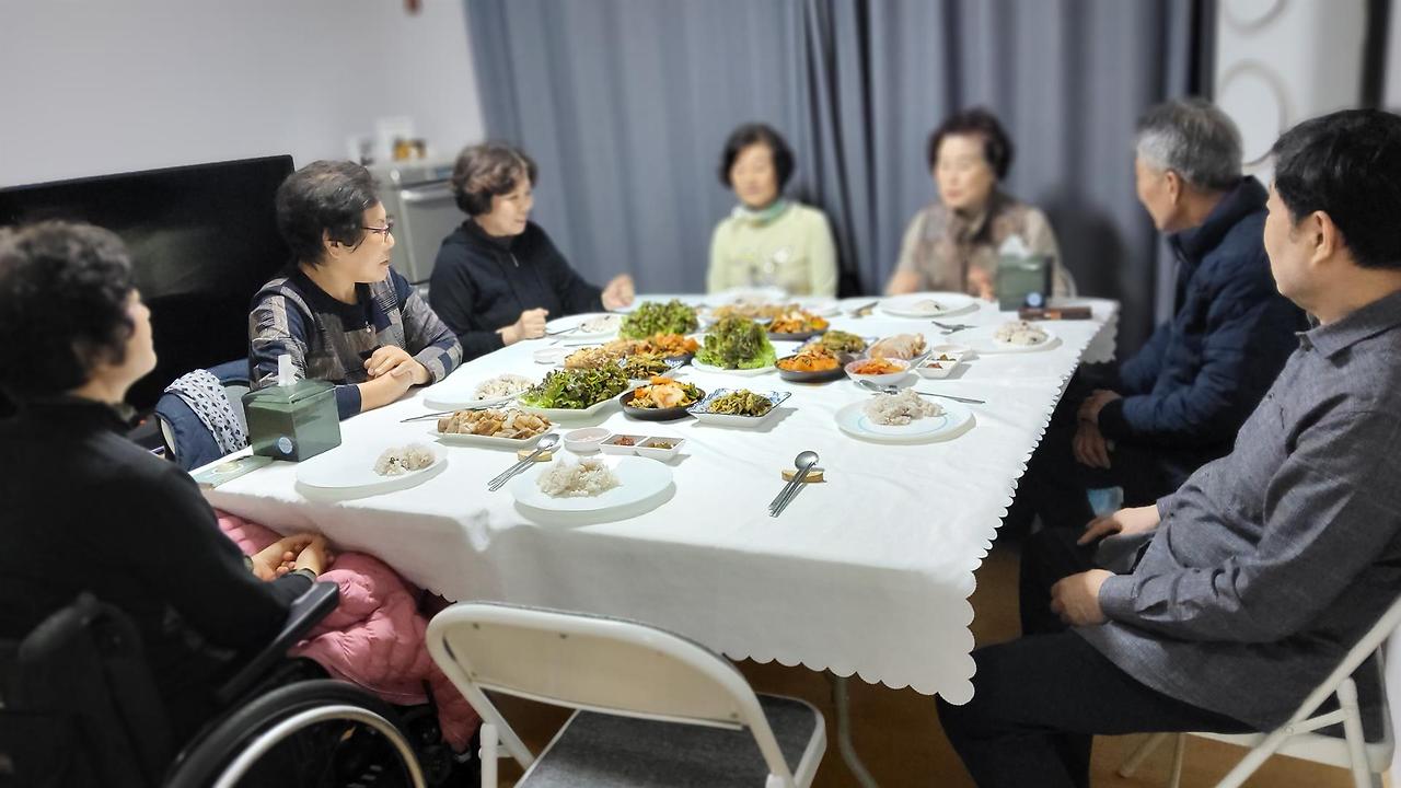 목자와 목원들이 함께 준비한 식사를 즐기며