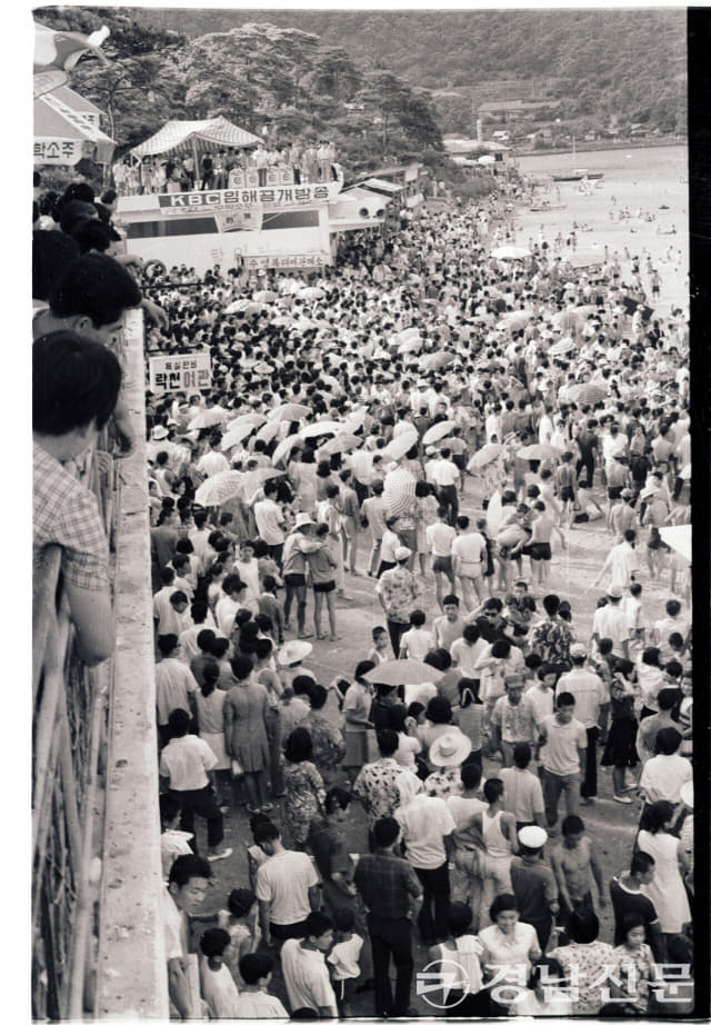 1960년대 말로 추정하는 가포 해수욕장의 여름 모습. 물 반 사람 반이라는 말에 들어맞는다. - 50년대 경남신문 기사에도 볼 수 있듯 가포해수욕장의 개장은 언제나 도민들에 알려져야 할 주요 소식이었으며, 64년의 기사에서는 가포해수욕장으로 들어가는 배 운임을 어린아이까지 어른 운임으로 받고, 해수욕장 시설도 엉망이라는 지적도 보입니다.