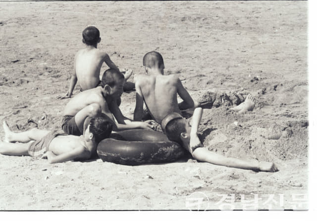 1960년대 후반 추정 가포 해수욕장에서 검은 고무 튜브를 베고 모래찜질을 즐기는 소년들의 모습